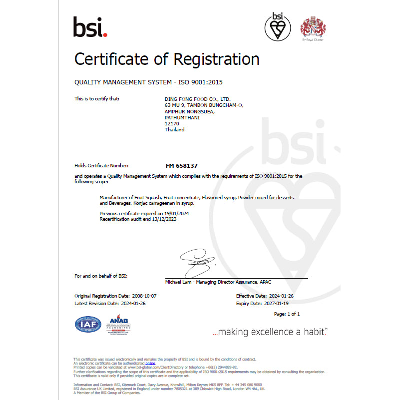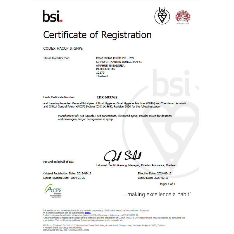 ได้รับการรับรองระบบ GHPs, HACCP และ ISO 9001-2015 สำหรับการผลิต FRUIT SQUASH จากบริษัท บีเอสไอกรุ๊ป (ประเทศไทย) จำกัด