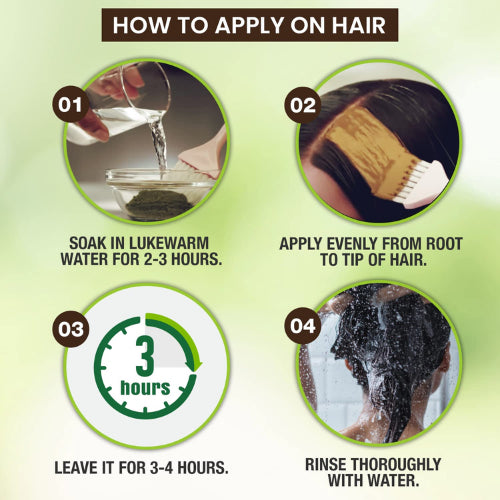 How to use: Mix henna with the desired ingredients and leave it on for 4-6 hours, or overnight. Before applying henna, shampoo your hair without using conditioner. Then apply henna and leave it on for 3-4 hours. Rinse thoroughly.