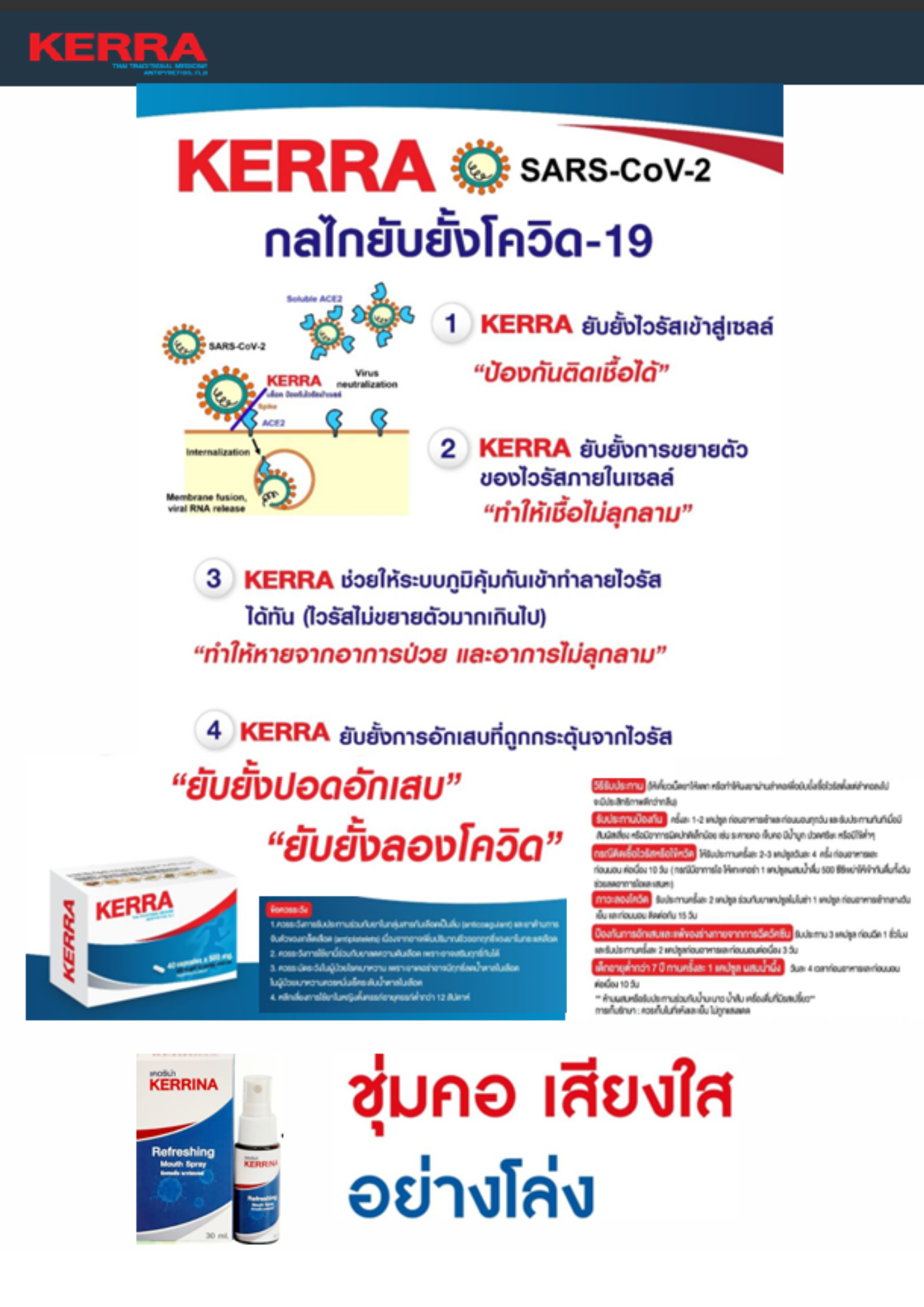 เคอริน่า สเปรย์ช่องปากพ่นคอชนิดเดียวที่มีผลวิจัยยับยั้ง COVID 19 มีส่วนประกอบจากสมุนไพล 20 ชนิด ฟ้าทะลายโจร มะขามป้อม สมอไทย สมอพิเภก ใบฝรั่ง ใบพิมเสน พรอพอลิส ว่านหางตระเข้ น้ำผึ้ง เปปเปอร์มินต์ สเปรียร์มินต์ ดอกการพลู ทีทรีออลย์ ใบไผ่ ย่านาง ดอกพิกุล กฤษณา บอระเพ็ด จันทร์แดง จันทร์ขาว