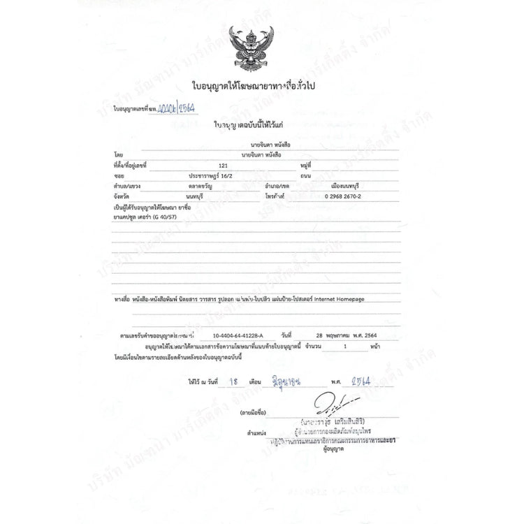 เลขใบอนุญาตโฆษณา ฆท.40406/2564