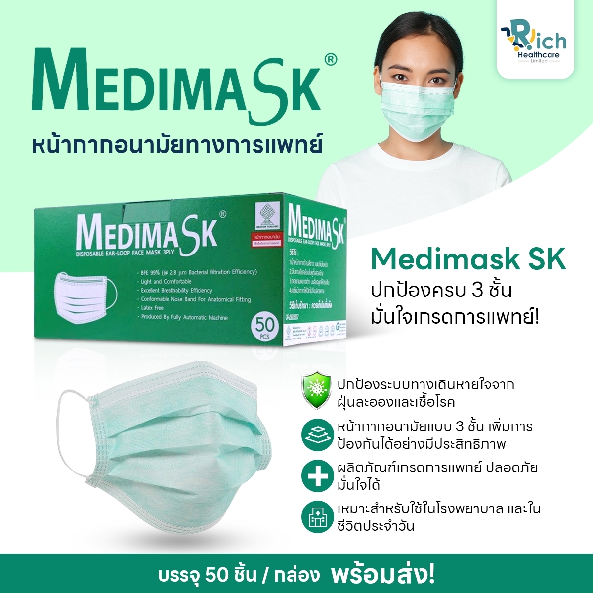Medimask SK หน้ากากอนามัย 3ชั้น 50ชิ้น ต่อกล่อง [1 ลัง 20 กล่อง] เกรดการแพทย์ ใช้ในโรงพยาบาล mask (green) 1 carton x 20