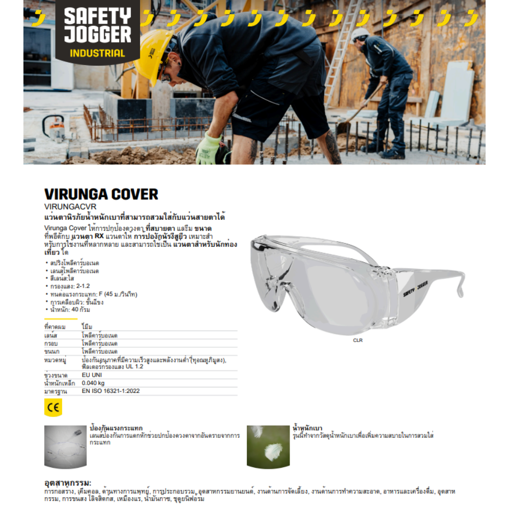 Safety Jogger - VIRUNGA COVER 1 ชิ้น แว่นตานิรภัย แว่นตากันฝุ่่น มีกรอบข้าง [Safety Eyewear] UV Protection
